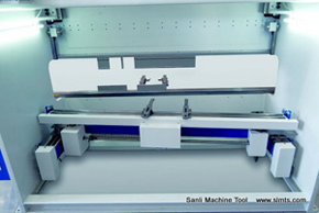 3、雙重擾度償機構(gòu)--上滑塊配有斜鍥式補償,下工作臺具有油缸自動補償,可以有效地補償滑塊與工作臺的擾度,真正地實現(xiàn)無盲區(qū)補償,確保折彎機精度。